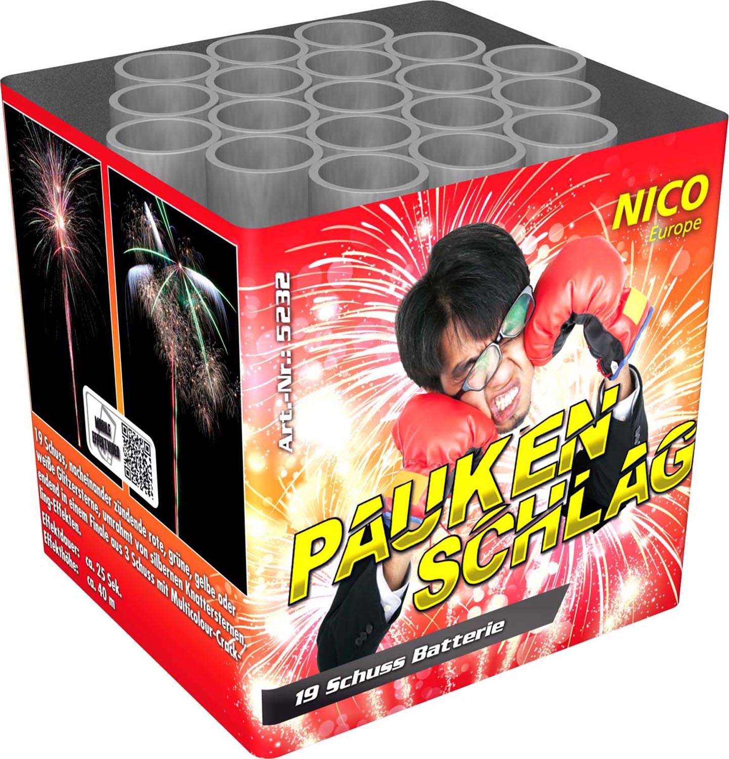 19 Schuss, nacheinander zündend, rote, grüne, gelbe oder weiße Glitzer-Sterne umrahmt von silbernen Knattersternen, endend in einem Finale mit 3 Multicolour-Crackling Effekten.